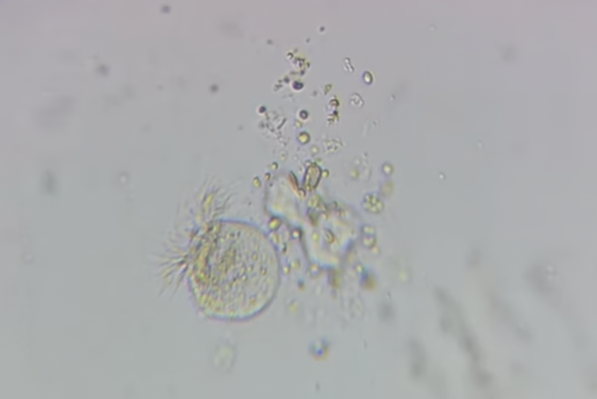 After I took another drop from the pond water, I went to look again. I looked around for a while and finally I noticed something that seemed to move. It was actually outside the cover slip in the water. I saw it had these hair like “legs” that were moving very fast. I thought this must be a living organism. I googled a bit and learned those flapping hairlike things are cilia. Solveit confirmed that this is probably the case. I wanted to document my findings and went to get my phone for its camera. After fumbling around trying to focus the camera and so on, I finally got the shot. I saw that the cilia weren’t moving anymore and that there was this extra stuff floating around it. I asked solveit and it told me that this is cell lysis, that the cell of the organism had bursted and its insides (possibly cellular organs) were floating outside. It was bit shocking and sad but then I figured that there are thousands if not millions of cells dying everyday even inside my body and that’s just how it is.